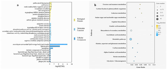 Enrichment analysis of differentially expressed genes in reference culture and makapuno callus. (a) Gene Ontology (GO) enrichment analysis of differentially expressed genes in reference culture and makapuno callus. (b) Significance bubble plot of KEGG pathway enrichment analysis for reference culture and makapuno callus.