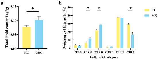 To further corroborate the differential expression results obtained from the Gene Ontology (GO) and Kyoto Encyclopedia of Genes and Genomes (KEGG) enrichment analyses [27], we conducted a comprehensive evaluation of the fatty acid composition in reference culture (RC) and makapuno (MK) callus tissues. We quantified the total lipid content and the relative percentages of various fatty acids within the total oil content. The results indicated that the total lipid content in the MK callus was significantly higher than that in the RC callus, with MK callus containing approximately 0.10 g of total lipids per gram of tissue, compared to only 0.078 g per gram in RC callus (Figure 5a). Following methylation, the relative abundance of individual fatty acids was determined [28]. As illustrated in Figure 5b, the primary fatty acids identified in both RC and MK callus included lauric acid (C12:0), myristic acid (C14:0), palmitic acid (C16:0), stearic acid (C18:0), oleic acid (C18:1), and linoleic acid (C18:2). Notably, myristic acid, palmitic acid, and linoleic acid exhibited significant differences in their relative proportions between the two callus types. In the MK callus, myristic acid accounted for a 5.09% higher proportion compared to the RC callus, while palmitic acid was elevated by 7.29%. Conversely, the proportion of linoleic acid in the MK callus was 13.21% lower than in the RC callus.