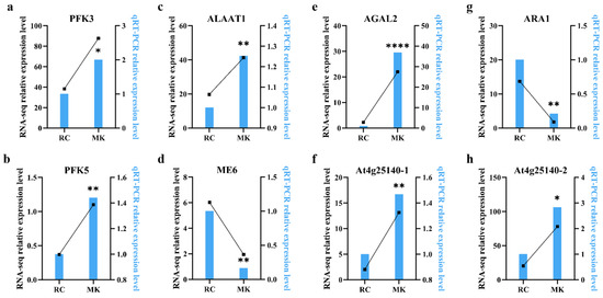 RNA-seq expression and qRT-PCR analysis of candidate genes. (a) PFK3 (6-phosphofructokinase 3). (b) PFK5 (6-phosphofructokinase 5). (c) ALAAT1 (alanine transaminase). (d) ME6 (malate dehydrogenase). (e) AGAL2 (alpha-galactosidase). (f) At4g25140-1 (OLE1). (g) ARA1 (L-arabinokinase). (h) At4g25140-2 (OLE1). * indicates a statistically significant difference (p < 0.05), ** (p < 0.01), and **** (p < 0.0001).