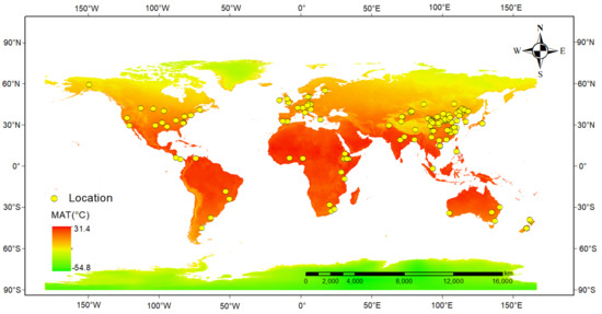 Location distribution of the study area. Base map derived from the World Climate Database; the yellow dots indicate the test sites, and MAT indicates the mean annual temperature.
