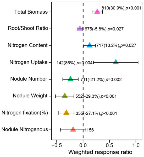 Overall analysis of the impact of nitrogen enrichment on leguminous plants. The black line in the figure represents the 95% confidence interval. Numbers outside this bracket indicate the sample size, numbers inside the bracket indicate the percentage change in the variable, >0 indicates a positive effect, <0 indicates a negative effect, and p < 0.05 indicates a significant response.