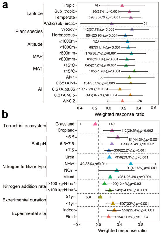 Subgroup analysis of the effect of nitrogen enrichment on the total biomass of leguminous plants. The black line in the figure represents the 95% confidence interval. Numbers outside these parentheses indicate sample size, numbers inside parentheses indicate percentage change in the variable, >0 indicates a positive effect, <0 indicates a negative effect, and p < 0.05 indicates a significant response. (a) subgroup analyses of Latitude, Plant life form, Altitude, MAP, MAT, and AI in total biomass of leguminous plants; (b) subgroup analyses of Terrestrial ecosystem, Soil pH, Nitrogen fertilizer type, Nitrogen addition rate, Experiment duration, and Experiment site in total biomass of leguminous plants.