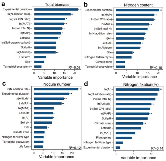 Differential importance of environmental factors and soil property response ratios for leguminous plants in response to nitrogen enrichment. * indicates p < 0.05, ** indicates p < 0.01. (a) Total biomass; (b) Nitrogen content; (c) Nodule number; (d) Nitrogen fixation (%).