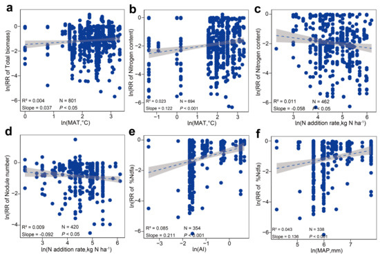 Relationship between growth traits, nitrogen fixation indicators and environmental factors in legumes under nitrogen enrichment. The dashed line and the grey thick-shaded line are the means of the slopes and the 95% confidence intervals of the correlation analyses, respectively. N indicates the sample size, slope > 0 indicates a positive correlation, slope < 0 indicates a negative correlation, and p < 0.05 indicates a significant correlation. (a) MAT and Total biomass; (b) MAT and Nitrogen content; (c) Nitrogen addition rate and Nitrogen content; (d) Nitrogen addition rate and Nodule number; (e) Al and %Ndfa; (f) MAP and %Ndfa.