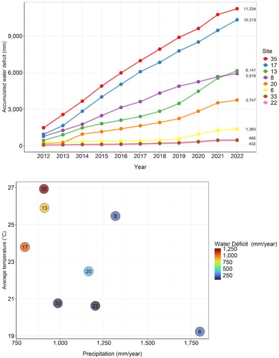 Accumulated water deficit from 2012 to 2022 (above), precipitation, average temperature, and water deficit in the first year of the coppice rotation at the PCoppice sites (below).
