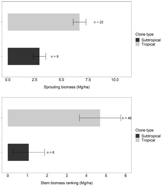 Sprouting biomass averages at 6 months (above) and wood biomass averages at 12 months (below) of clones classified as tropical and subtropical, where n represents the number of plots of each type. The error bar indicates the standard error of the mean.