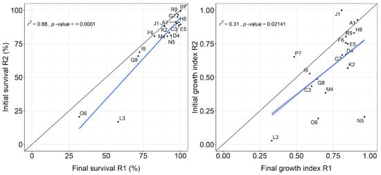 Relationships between final survival in initial rotation and initial survival in coppice rotation grouped by clone (left), final growth index in initial rotation, and initial growth index in coppice rotation (right). The black line represents the 1:1 ratio, and the blue line represents the linear regression.