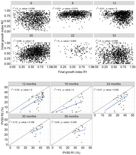 Relationships between final growth index in initial rotation and initial growth index in coppice rotation at individual level by site (above), final uniformity (PV50) in initial rotation, and initial uniformity in coppice rotation by age (below). The black line represents the 1:1 ratio, and the blue line represents the linear regression.
