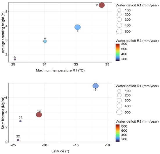 Relationships between sprouting height at 6 months (above) stem biomass at 12 months (below), and climatic variables show that the driest sites in the initial rotation became the most productive at the beginning of the coppice rotation.