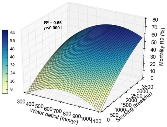 Relationship between mortality in the second rotation (R2), water deficit, and stocking.
