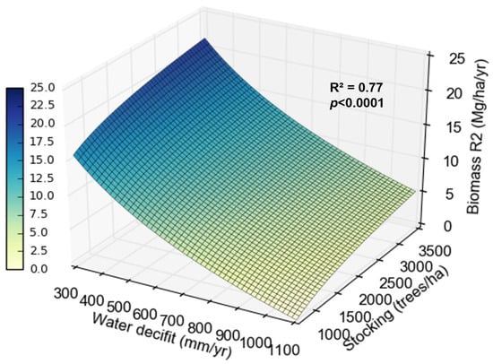 Relationship between biomass production in the second rotation (R2), water deficit, and stocking.