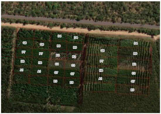 Seventeen commercial Eucalyptus clones were evaluated: nine tropical clones (A1, C3, D4, E5, G7, H8, P7, Q8, R9), and eight subtropical clones (F6, I9, J1, K2, L3, M4, N5, O6), according to its genotype and climate of the breeding pipeline site (Table 3). The genotypes were grouped by the breeders of the TECHS group, as shown in the paper published by Binkley et al. [] (refer to Figure 2 on page 3). Genotypes previously classified as plastic in the TECHS study (A1, C3, K2, and Q8) were reclassified as tropical or subtropical in this study. This reclassification was necessary because they did not exhibit truly plastic behavior during the initial rotation.