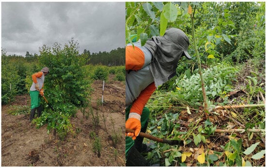 Ant control baits were applied approximately 2 months before harvest, adhering to local company protocols. Harvested stems were removed from the sites within a month, along with residues that could potentially shade or impede the growth of the new sprouts. Fertilizer applications followed the patterns used by each company in their commercial coppice areas, typically consisting of 1950 kg ha−1 of limestone, 66 kg N ha−1, 65 kg P ha−1, and 120 kg K ha−1 on average. Weed control was performed approximately twice until canopy closure, employing glyphosate at a rate of 2.88 kg of active ingredient ha−1, applied manually with care to avoid contact with tree leaves. After 12 months, weed control with the same method was performed on average once a year, depending on the degree of weed infestation.