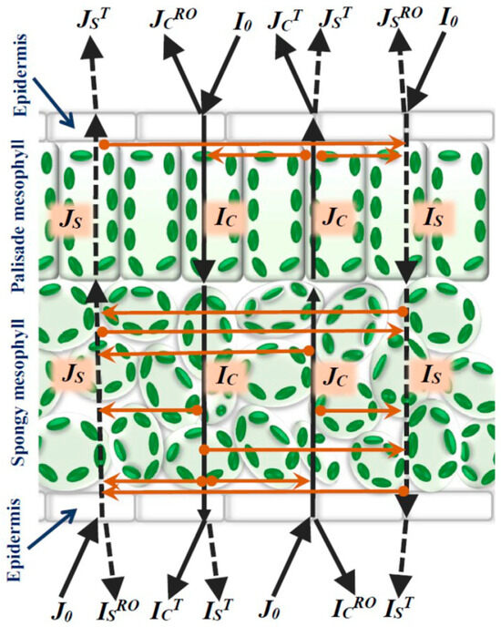 where JC(0) and IC(h) are the intensities of collimated backward and forward light on upper and lower borders of the palisade mesophyll layer, respectively; JS(0) and IS(h) are intensities of scattered backward and forward light on upper and lower borders of the palisade mesophyll layer, respectively; and JSAdd is the additional scattered light. JSAdd is caused by the scattering (and changing light direction) of the scattered (IS(x)) and collimated (IC(x)) forward light in the palisade mesophyll layer. The JSAdd should have low intensity; however, it can be important for the plant remote sensing based on measuring reflectance at red and light spectral bands, which have high light absorption.