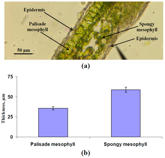 Cross-sections of pea leaves were manually prepared using a razor blade in accordance with the widely used botanical method. The leaf fragment was fixed by two plates of foam plastic; further, cross-sections were cut, placed into a water drop on the microscope slide, and fixed by the cover glass. Microscope MT 4200 with lens Plan Achromat 40X and ocular micrometer (Meiji Techno, Saitama, Japan) was used to estimate thicknesses of the palisade and spongy mesophyll layers.