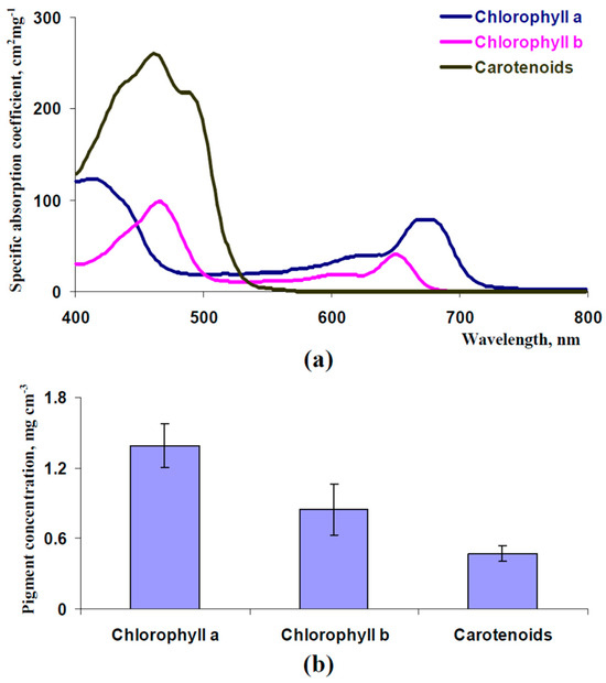 Spectra of specific light absorption coefficients for chlorophyll a, chlorophyll b, and carotenoids (on an example of β-carotene) (a) and average concentrations of these pigments in pea leaves (n = 6) (b). The spectra of light absorption were constructed on the basis of [58]. The pigment concentrations were experimentally measured. The second mature leaf was used. Pea plants were cultivated for 16 days under moderate light intensity.