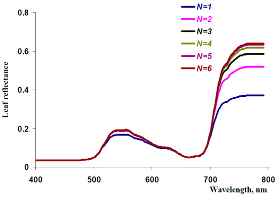 Figure 4 shows model-based reflectance spectra, which were calculated at different quantities of the iterations (N) in accordance with Equation (58). It was shown that reflectance of visible light was accurately described at N = 2 (or more) because increasing N did not influence the reflectance spectra at N ≥ 2. Moreover, N = 1 could be used for the calculation of the leaf reflectance in blue and red spectral regions; a small error was observed in the green spectral region only. In contrast, an accurate description of the NIR reflectance was observed at N ≥ 5 because increasing N influenced model-based leaf reflectance spectra at N ≤ 5. As a result, we used N = 6 for further analysis to completely exclude technical error, which could disrupt results at low N.