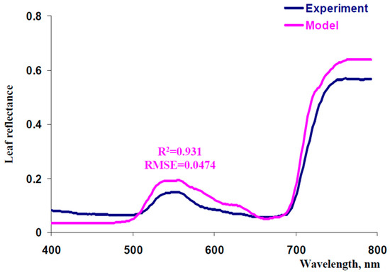 Figure 5 shows experimental and model-based spectra of leaf reflectance. The model-based spectrum was calculated at initial values of parameters (see above) and N = 6. This result showed that the model-based spectrum was similar to the experimental one in a qualitative manner; however, quantity differences were also observed (especially in blue, green, and NIR spectral regions).