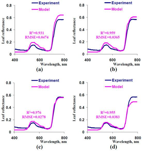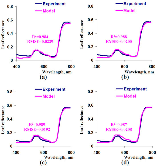 Model-based spectra of leaf reflectance at 1000 cm−1 (a), 800 cm−1 (b), 600 cm−1 (c), and 400 cm−1 (d) and the experimental spectrum (from Figure 5). Other parameters of the model were the same as the parameters that were used for the simulation of the spectrum in Figure 5. R2 and RMSE are, respectively, the determination coefficient and root mean square error between the experimental and model-based spectra.