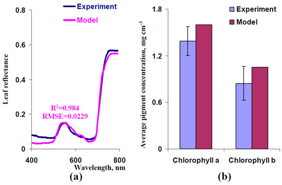 Second, we used small corrections of CChA and CChB to increase the determination coefficient between experimental and model-based reflectance spectra. It was shown that using CChA = 3.19 mg cm−3 and CChB = 2.09 mg cm−3 improved the accuracy of the description of the experimental leaf reflectance spectrum (Figure 7a). Average leaf concentrations of chlorophyll a and b, which were calculated on the basis of these values of CChA and CChB, were similar to experimental ones (differences approximately equaled to standard errors of experimental values of concentrations of chlorophylls). Thus, we used corrected CChA and CChB in further analysis of the model.