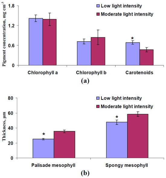 The following supporting information can be downloaded at: https://www.mdpi.com/article/10.3390/plants13223258/s1, Figure S1: Scheme of cultivation of pea and measurements of its parameters (a) and photos of plants, which were cultivated under moderate and low light intensity (b); Figure S2: Spectra of leaf reflectance calculated at CCar = 1.5 mg cm−3, CCar = 1 mg cm−3, and CCar = 0.5 mg cm−3; Figure S3: Experimental concentrations of chlorophyll a, chlorophyll b, and carotenoids (a) and thicknesses of palisade and spongy mesophyll (b) in second mature leaves of pea plants, which were cultivated for 9 days under the low and moderate light intensity (n = 6); Figure S4: Experimental (a) and model-based (b) spectra of leaf reflectance in pea plants, which were cultivated for 9 days under the low and moderate light intensity (n = 6 for experiments).