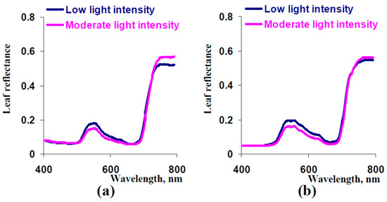However, relationships of specific reflectance indices in leaves to specific plant characteristics can be varied [3]; for example, this variability was shown [21,22,23] for photochemical reflectance index based on reflectance at 531 and 570 nm. It is known that this index is dependent on the acidification of the chloroplast lumen (through transitions in the xanthophyll cycle [17,19] and through the chloroplast shrinkage [20]) and, therefore, should be potentially related to photosynthetic processes. Moreover, our earlier meta-analysis of experimental studies [23] showed that average linear correlation coefficients between values of photochemical reflectance indices and photosynthetic parameters (the photosynthetic light use efficiency, potential quantum yield of photosystem II, and non-photochemical quenching of chlorophyll fluorescence) are about 0.5–0.6.