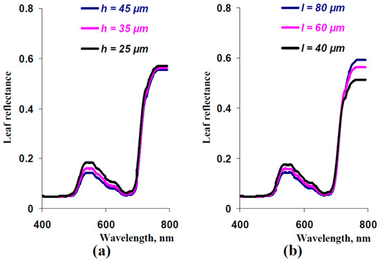 Parameterization of the developed model of leaf reflectance was the first task. Thicknesses of palisade and spongy mesophyll layers (Figure 2b) and concentrations of the chlorophyll a, chlorophyll b, and carotenoids (Figure 3b) were estimated using experimental methods in the leaves of pea plants (see Section 2.7). Measured reflectance spectra of these leaves were used to check the accuracy of the developed model. It should be noted that pea leaves were used as an example of leaves of dicot plants, which have palisade and spongy mesophyll layers [38]; the model cannot be used to describe reflectance of leaves of monocot plants with uniform mesophyll.
