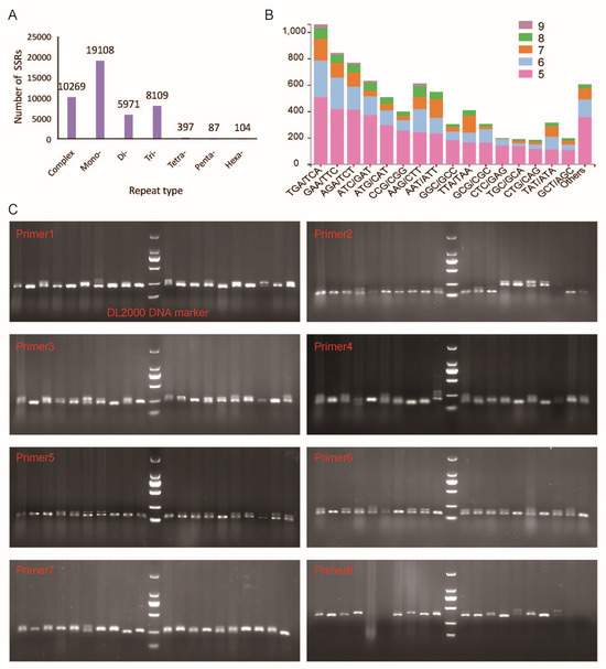- Jiang, H.; Waseem, M.; Wang, Y.; Basharat, S.; Zhang, X.; Li, Y.; Liu, P. Development of simple sequence repeat markers for sugarcane from data mining of expressed sequence tags. Front. Plant Sci. 2023, 14, 1199210. [Google Scholar] [CrossRef]