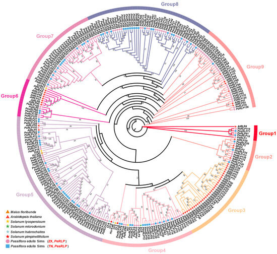 To explore the evolutionary relationships among RLPs of eight plants, a phylogenetic analysis was conducted using Maximum Likelihood (ML) methods (Figure 1). The result showed that all RLP members cluster into nine distinct subgroups, labeled Group 1–9. This classification was supported by bootstrap values ranging from 60% to 100%, indicating the reliability of the RLP genes subfamily classification. A substantial number of PeRLP and PesRLP members were assigned to two groups (Group 5 and Group 8). Group 5 had the largest number of RLP members, including known disease resistance genes such as HcrVf2, EIX2, and homologous genes (35 PeRLPs and 21 PesRLPs) in passion fruit. Group 8 had the second largest number of RLP members, containing 50 RLP genes, but lacked homologs genes in Arabidopsis and tomato. Most AtRLPs were clustered together to form Arabidopsis-specific evolutionary branches (Group 3). These results suggested that PeRLPs and PesRLPs had undergone expansion following their divergence from a common ancestor with Arabidopsis.