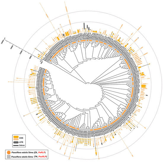 Through excluding redundant sequences and genes encoding proteins with NB-ARC domains or kinase domains and verifying the RLP gene structures, 141 RLP-encoding genes in the passiflra edulis Sims (Zixiang, referred to as “ZX”) genome and 79 RLP-encoding genes in the passiflra edulis Sims (Tainong, referred to as “TN”) genome were identified. The number of two passion fruit RLPs had a significant expansion compared to the 57 AtRLP members in Arabidopsis. The RLP genes were renamed PeRLP1-141 (ZX) and PesRLP1-79 (TN) according to the location of the RLP genes to the respective chromosomes in the passion fruit genome. The 141 PeRLPs and 79 PesRLPs were distributed across nine chromosomes with varying numbers and uneven distribution (Figure S1). Many PeRLP genes were clustered in specific chromosomal regions in the ZX genome. For example, the highest number of PeRLP genes were found on Chr1 and Chr2, with 63 and 31 genes, respectively. Chr7 and Chr8 contain only 1 and 2 PeRLP genes, respectively. LG02 and LG05 had the highest number of PesRLP genes, with 13 and 31 genes in the TN genome, respectively. According to MCScanX results, dispersed and proximal duplications account for more than two-thirds of the duplication events in the ZX and TN genomes. These results indicated that the formation of these gene clusters and the expansion of RLP genes in passion fruit were likely due to these types of duplications.