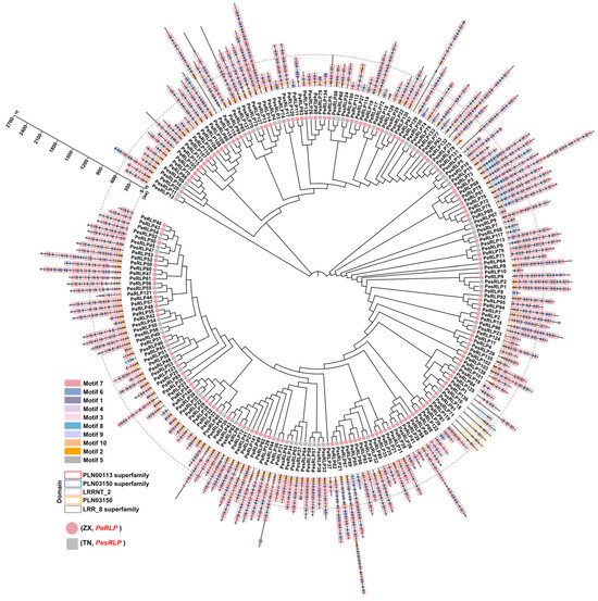 Conserved motif analysis of 141 PeRLP and 79 PesRLPs in the ZX and TN genomes. Different color modules indicated different motifs. Different color boxes indicate different conserved domains. The dotted line circles indicated the length of RLP proteins.