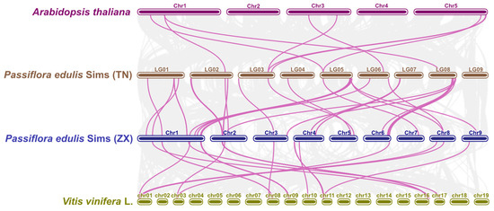 Synteny analysis of RLP genes in four plants, including Arabidopsis, Passiflora edulis Sims (ZX), Passiflora edulis Sims (TN), and Vitis vinifera L. genome. The purple lines display the collinear RLP genes among four plant genomes (Arabidopsis, TN, ZX and Vitis vinifera L.). The light gray lines represented collinear blocks.