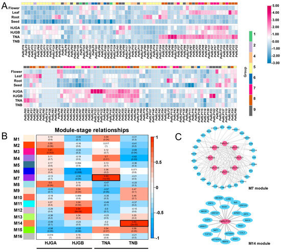Expression profiles of 141 PeRLP genes. (A) Expression patterns of PeRLP genes in different tissues (root, leaf, seed, and flower) and seedlings of passion fruit with cold treatment. Three biological replicates of HJG (HJGA1, HJGA2, and HJGA3 were recorded as HJGA) and TN (TNA1, TNA2, and TNA3 were recorded as TNA) under normal temperature conditions. Three biological replicates of HJG (HJGB1, HJGB2, and HJGB3 were recorded as HJGB) and TN (TNB1, TNB2, and TNB3 were recorded as TNB) under cold stress. Differences in gene expression changes were shown in color as the scale, mediumvioletred for high expression, and steelblue for low expression. (B,C) Weighted gene co-expression network (WGCNA) was used to identify resistance genes associated with cold-tolerant variety TN. M1-M16 module indicated that the main branches constituted 16 merge modules (based on a threshold of 0.25) and were marked with different colors. Coexpression networks were constructed with eight and one PeRLP hub genes in the M7 and M14 modules, respectively.