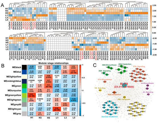 Analysis of gene co-expression network in RNA-seq data of passion fruit infected by R. solani. (A) Transcriptional expression analysis of 141 PeRLP during the infection of resistant variety LG and sensitive variety with R. solani. The heatmap was created based on the log2 (FPKM + 0.01) value of PeRLP genes and normalized by row. Differences in gene expression changes are shown in color as the scale, orange for high expression, and steelblue for low expression. L1, L3, and L5, respectively, represented the 1, 3, and 5 days after the resistant cultivar LG was infected by R. solani. H1, H3, and H5, respectively, represented the 1, 3, and 5 days after the sensitive cultivar HG was infected by R. solani. (B) The correlation analysis of modules and stages by using WGCNA, the heat map showed the correlation between modules and stages. Red and blue indicated positive and negative correlations, respectively. (C) The co-expression gene network was constructed with PeRLP8 as the center in the MEblue module. SA signaling, Salicylic acid signaling; ETH biosynthesis and signaling, Ethene biosynthesis and signaling; ABA biosynthesis and catabolism, Abscisic acid biosynthesis and catabolism; JA biosynthesis and signaling, Jasmonic acid biosynthesis and signaling; ROS metabolism, reactive oxygen species metabolism.