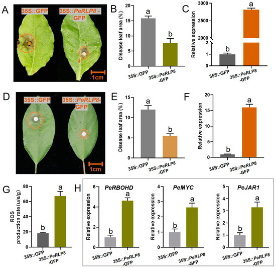 To further study the role of PeRLP8 in responding to R. solani, the CDS sequence of the PeRLP8 gene was successfully cloned and sequenced. The constructed empty control 35S:: GFP and 35S:: PeRLP8-GFP were injected into passion fruit and tobacco leaves separately. Then, these leaves were inoculated with the fungal pathogen R. solani. It was observed that the passion fruit and tobacco disease leaves in the area of the leaves injected with 35S:: PeRLP8-GFP construct was significantly reduced by 54.17% and 52.06%, respectively (Figure 7A,B,D,E) and the expression of PeRLP8 showed significantly up-regulated in injected areas compared to the control group (Figure 7C,F). These results suggested that the immune response was evoked after transient overexpression of the PeRLP8 gene.