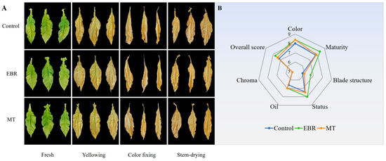 Tobacco during curing stage. (A) The appearance of tobacco during curing stage; (B) The appearance quality evaluation of tobacco leaves at stem-drying stage. EBR, tobacco leaves of EBR-treated; MT, tobacco leaves of MT-treated.