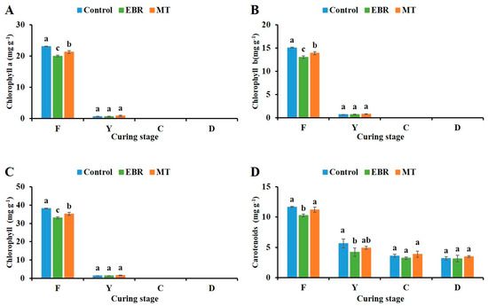 Pigment content of tobacco leaves during curing stage. (A) Chlorophyll a; (B) Chlorophyll b; (C) Chlorophyll; (D) Carotenoids. EBR, tobacco leaves of EBR-treated; MT, tobacco leaves of MT-treated; F, fresh leaves; Y, yellowing stage; C, color fixing stage; D, stem-drying stage. “a, b, c” in the table mean significant difference among different treatments (p < 0.05).