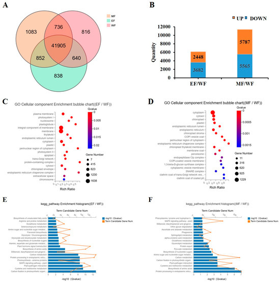 Analysis of gene expression level in transcriptome of fresh tobacco leaves. (A) Co-expression Venn diagram; (B) Number of differential genes; (C) Gene ontology (GO) enrichment analysis of differentially expressed genes (DEGs) in EF/WF; (D) GO enrichment analysis of DEGs in MF/WF; (E) Kyoto encyclopedia of genes and genomes (KEGG) enrichment analysis of DEGs in EF/WF; (F) KEGG enrichment analysis of DEGs in MF/WF. WF, fresh tobacco leaves of control; EF, fresh tobacco leaves of EBR-treated; MF, fresh tobacco leaves of MT-treated.