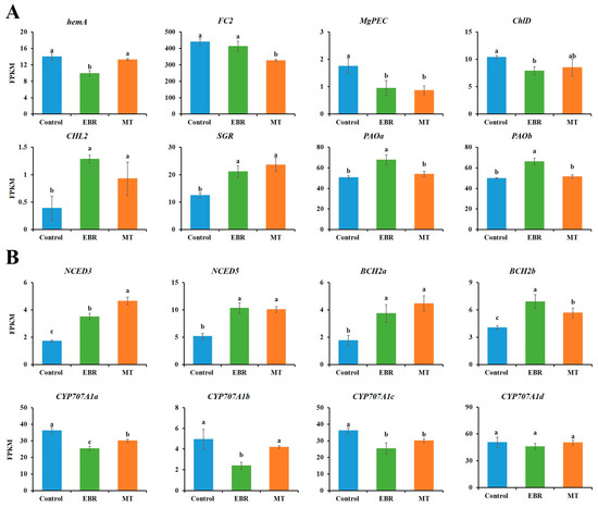 The expression of differentially expressed genes (DEGs) in pigment pathway. (A) The expression of DEGs in Porphyrin and chlorophyll metabolism pathway; (B) The expression of DEGs in Carotenoid biosynthesis pathway. EBR, tobacco leaves of EBR-treated; MT, tobacco leaves of MT-treated. “a, b, c” in the table mean significant difference among different treatments (p < 0.05).