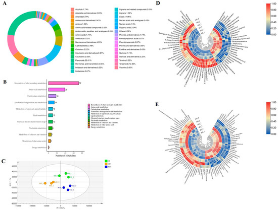 Metabolomic analysis of tobacco leaves at stem-drying stage. (A) Metabolite classification; (B) Kyoto encyclopedia of genes and genomes (KEGG) enrichment analysis of metabolites; (C) Partial least squares discriminant analysis (PLS-DA) plot; (D) Clustering analysis of differentially abundant metabolites (DAMs) in ED/WD; (E) Clustering analysis of DAMs in MD/WD. WD, tobacco leaves of control at stem-drying stage; ED, tobacco leaves of EBR-treated at stem-drying stage; MD, tobacco leaves of MT-treated at stem-drying stage.