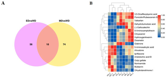 To further investigate the effects of EBR and MT on the DAMs in tobacco leaves at stem-drying stage, it was found in the Venn diagram that there were 18 common DAMs of ED/WD and MD/WD (Figure 7A), of which 16 DAMs exhibited the same trend, in which 8 DAMs were up-regulated, such as diosmetin, chrysoeriol, and hydroxygenkwanin, while 8 DAMs were down-regulated, such as aristolochic acid B, octyl gallate, and 5-aminosalicylic acid. Notably, two exceptional DAMs showed contrasting regulation: glabrone was up-regulated in ED and down-regulated in MD, (-) -gallocatechin was up-regulated in MD and down-regulated in ED (Figure 7B). In addition, there were 56 DAMs unique to ED/WD and 74 DAMs unique to MD/WD.