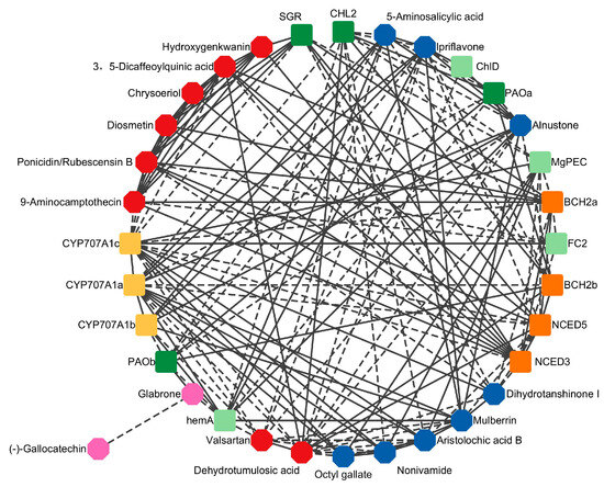 Correlation analysis between co-expressed differentially abundant metabolites (DAMs) and pigment genes. The octagonal is DAMs, the square is the pigment gene.