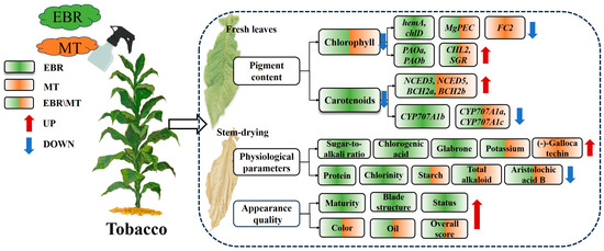 Numerous studies have demonstrated that EBR and MT play crucial roles in promoting crop growth and development, flowering, fruit ripening, and enhancing resistance to abiotic stress [16,27,28]. This study investigates the physiological and molecular mechanisms underlying the improvement of tobacco leaf quality through EBR and MT treatment. Specifically, EBR and MT treatments enhance the maturity of tobacco leaves by regulating the pigment content, as well as improving the overall quality during the stem-drying stage by influencing physiological parameters and aesthetic characteristics. Additionally, transcriptome data were employed to identify pigment-related genes responsive to EBR and MT application, thereby characterizing the molecular mechanisms by which EBR and MT enhance tobacco leaf maturity (Figure 9).