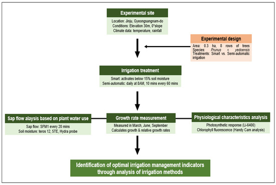Based on these analyses, the effects of irrigation methods on the growth and physiological characteristics of cherry trees were evaluated, leading to the derivation of optimal irrigation management strategies (Figure 1).