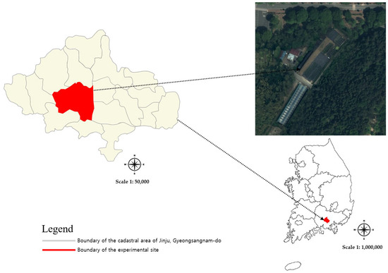 The experiment was conducted at the experimental forest of the Forest Biomaterials Research Center, National Institute of Forest Science, located in Jinju, Gyeongsangnam-do, South Korea (N35°09′48.5″, E128°06′03.6″) (Figure 2). The study area is situated at an elevation of 30 m with a slope of 0°. The region experiences a mild climate, and during the study period (1 March to 30 September 2023), the average temperature was 21.7 °C, with a maximum temperature of 36.4 °C and a minimum temperature of −1.0 °C. Total precipitation amounted to 331.9 mm, with July experiencing concentrated rainfall of 504.5 mm. Meteorological data (WP-700C, MIRAE SENSOR, Seoul, Republic of Korea) were collected at 10 min intervals, including measurements of temperature (°C), precipitation (mm), wind speed (m/s), humidity (%), vapor pressure (hPa), dew point temperature (°C), sunshine duration (h), solar radiation (MJ/m2), and ground temperature (°C).