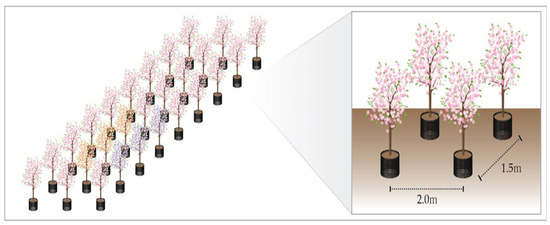 The study area covers 0.3 ha, and the trees are arranged in 8 rows. The spacing between rows is 2.0 m, and the spacing between trees within a row is 1.5 m (Figure 3). The test species used in the experiment is the Yoshino cherry tree (DBH 4 cm), which was grown at the National Institute of Forest Science’s Subtropical and Temperate Forest Research Institute. In March 2022, the trees were transplanted into container pots (40 L) filled with potting soil (7073926501, Gumok, Seoul, Republic of Korea) at the Experimental Forest of the Forest Biomaterials Research Institute of the National Institute of Forest Science and underwent an acclimatization process for one year. In March 2023, the height of the trees ranged from 3.1 to 3.3 m, and for the study, trees starting from the third row, where a weather station was installed, were selected. A total of six trees were divided into two groups for irrigation (smart automatic irrigation method and semi-automatic irrigation method), with each group consisting of three trees.
