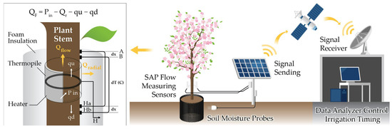 Accurate data are essential for maintaining optimal growth conditions, yet objective and scientific data on the relationship between irrigation quantities, frequency, rainfall, soil moisture, and the permanent wilting point of tree species are scarce. Plant transpiration, accounting for 80–90% of total evapotranspiration, is driven passively by negative water potential created by evaporation from leaf cells [10]. Sap flow measurement using heat pulse velocity is widely used due to its low cost, reliability, and low power requirements, providing estimates of whole-tree transpiration [11,12,13,14,15,16]. The Sap Flow Meter (SFM1) has been demonstrated to accurately and reliably measure zero, low, and high sap flow across a wide range of plant species under various environmental conditions following a short heat pulse [17].