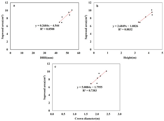 Correlations between DBH, height, and canopy area with sapwood area for the Prunus × yedoensis used in these experiments. (a) DBH and sapwood area; (b) height and sapwood area; (c) canopy area and sapwood area.