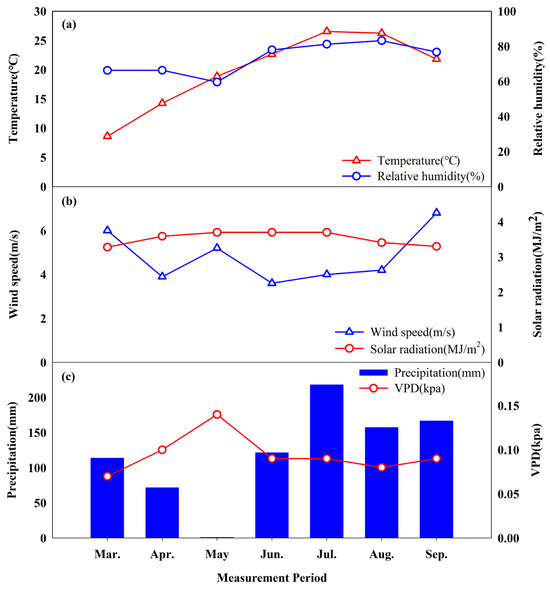 Meteorological parameters collected for the study sites. (a) Temperature and relative humidity; (b) wind speed and solar radiation; (c) precipitation and VPD.
