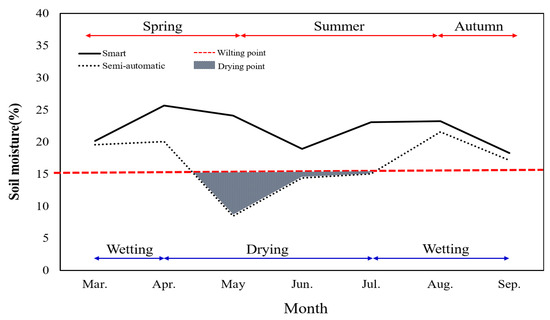 Figure 7 shows the changes in soil moisture content within container pots over the 7-month monitoring period (1 March to 30 September) based on irrigation treatments. The monthly average temperature ranged from 18.3 to 25.7 °C with smart automatic irrigation and 8.5–21.6 °C with semi-automatic irrigation. According to previous research by the National Institute of Forest Science, the optimal soil moisture content range within containers for Prunus × yedoensis with a diameter at breast height (DBH) of 3 cm or more is 15–25% from March to April and 18–25% from May to August. In this study, smart automatic irrigation maintained optimal soil moisture content within the containers, while semi-automatic irrigation resulted in soil moisture levels below the recommended range.